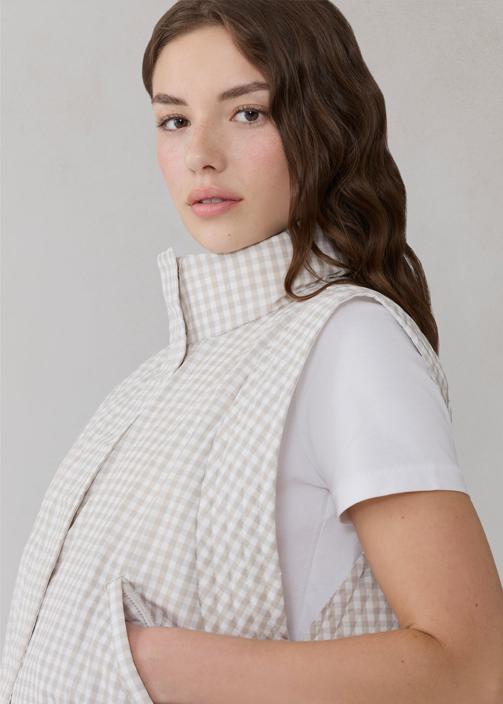 BRENNA Reversible Down Bomber Vest in Gingham
