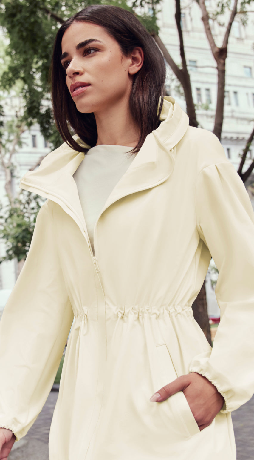 The collection introduces pleated trench coats, lightweight layering pieces, and an expanded