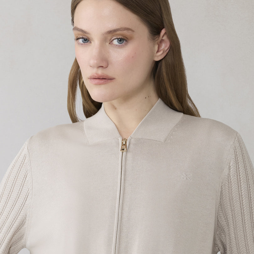 The collection’s color palette evokes a poolside reflection, with sunlit neutrals paired with mineral blues and soft hydrangea hues. These tones reflect the balance between urban structure and natural serenity. Texture appears through delicate floral embroidery and a gingham puffer style, adding dimension while maintaining clarity and ease.