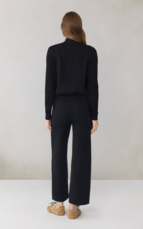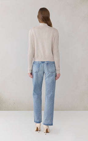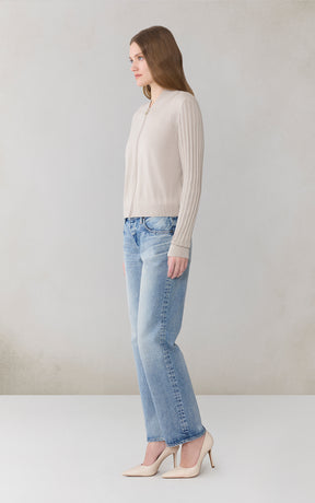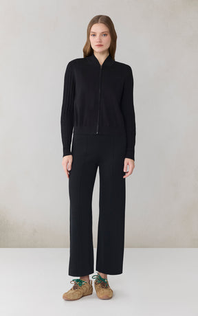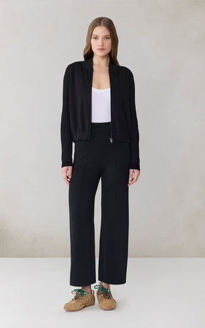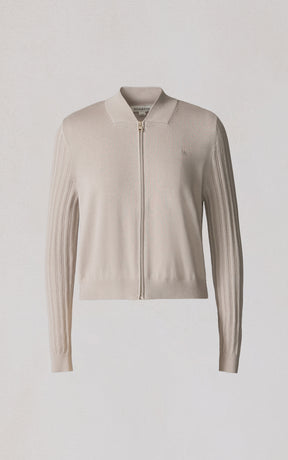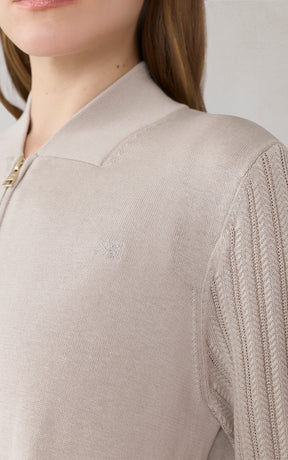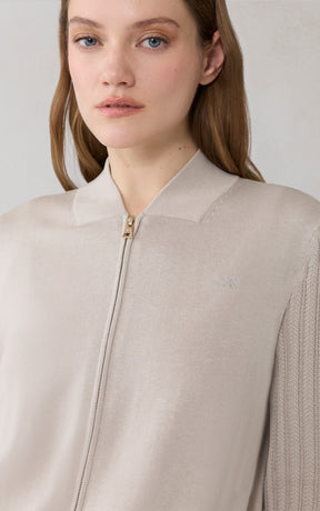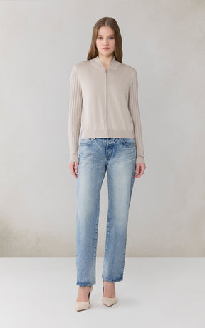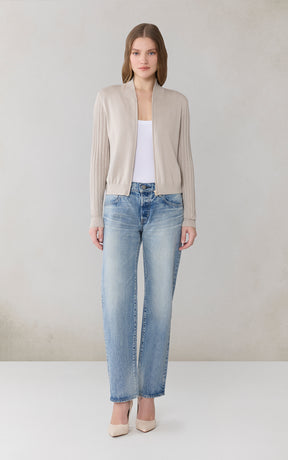 LORETTA by SOIA is a lightweight knit bomber blending silk and cotton for an airy, refined feel. With pointelle details and a ribbed trim, it’s a laid-back yet elevated piece that brings texture to your everyday look.