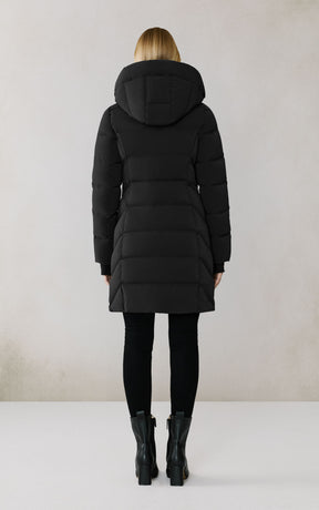 SONNY-N by SOIA & KYO is a sleek down coat engineered for deep winter. With channel and chevron quilting, a hidden-closure hood, and a warm quilted bib, it’s filled with premium RDS-certified down and rated for -25 °C. Storm cuffs and fleece-lined pockets lock in the heat for true cold-weather comfort.